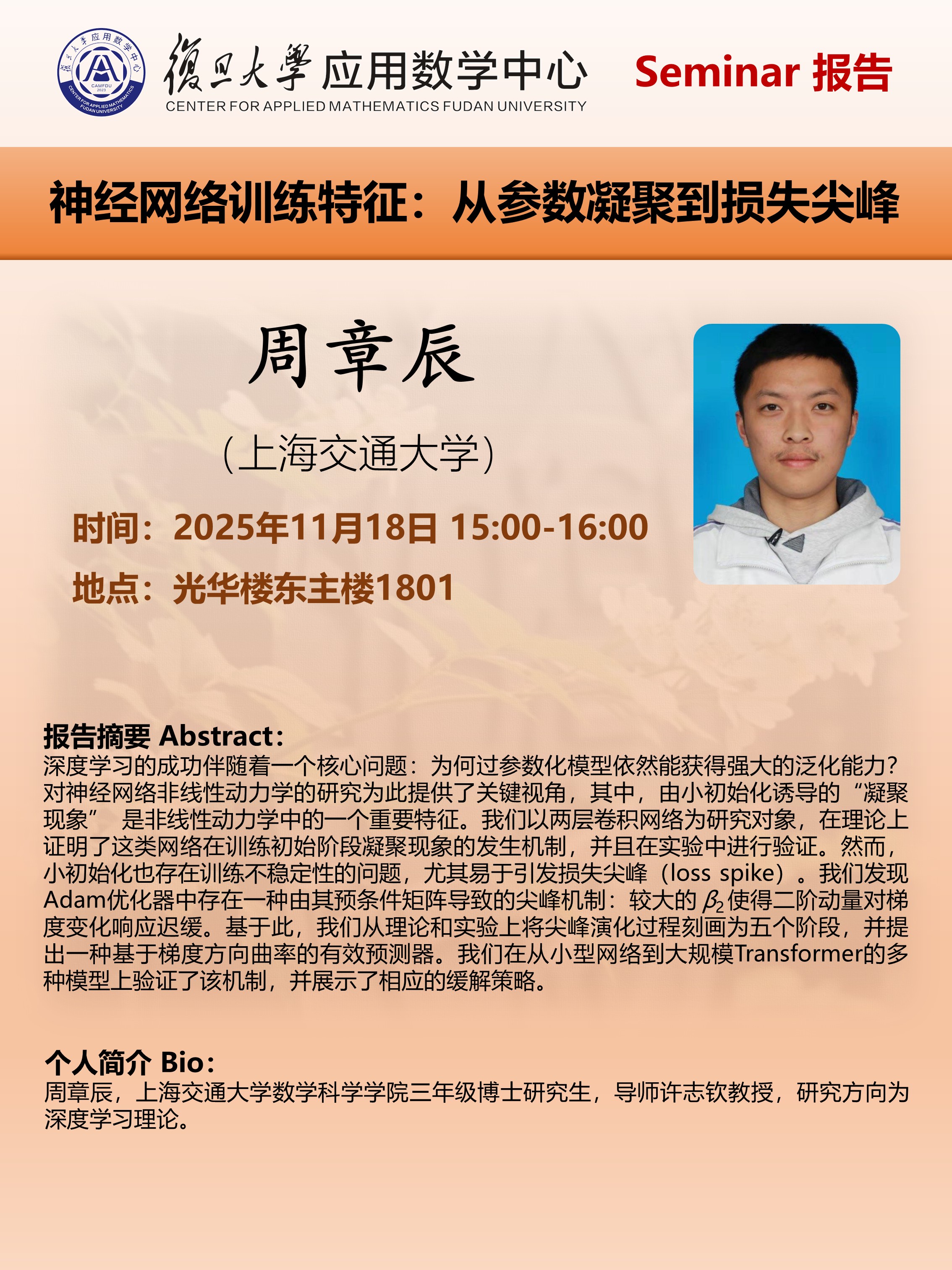 报告摘要 Abstract:深度学习的成功伴随着一个核心问题:为何过参数化模型依然能获得强大的泛化能力?对神经网络非线性动力学的研究为此提供了关键视角,其中,由小初始化诱导的“凝聚现象” 是非线性动力学中的一个重要特征。我们以两层卷积网络为研究对象,在理论上证明了这类网络在训练初始阶段凝聚现象的发生机制,并且在实验中进行验证。然而,小初始化也存在训练不稳定性的问题,尤其易于引发损失尖峰(loss spike)。我们发现Adam优化器中存在一种由其预条件矩阵导致的尖峰机制:较大的β2使得二阶动量对梯度变化响应迟缓。基于此,我们从理论和实验上将尖峰演化过程刻画为五个阶段,并提出一种基于梯度方向曲率的有效预测器。我们在从小型网络到大规模Transformer的多种模型上验证了该机制,并展示了相应的缓解策略。