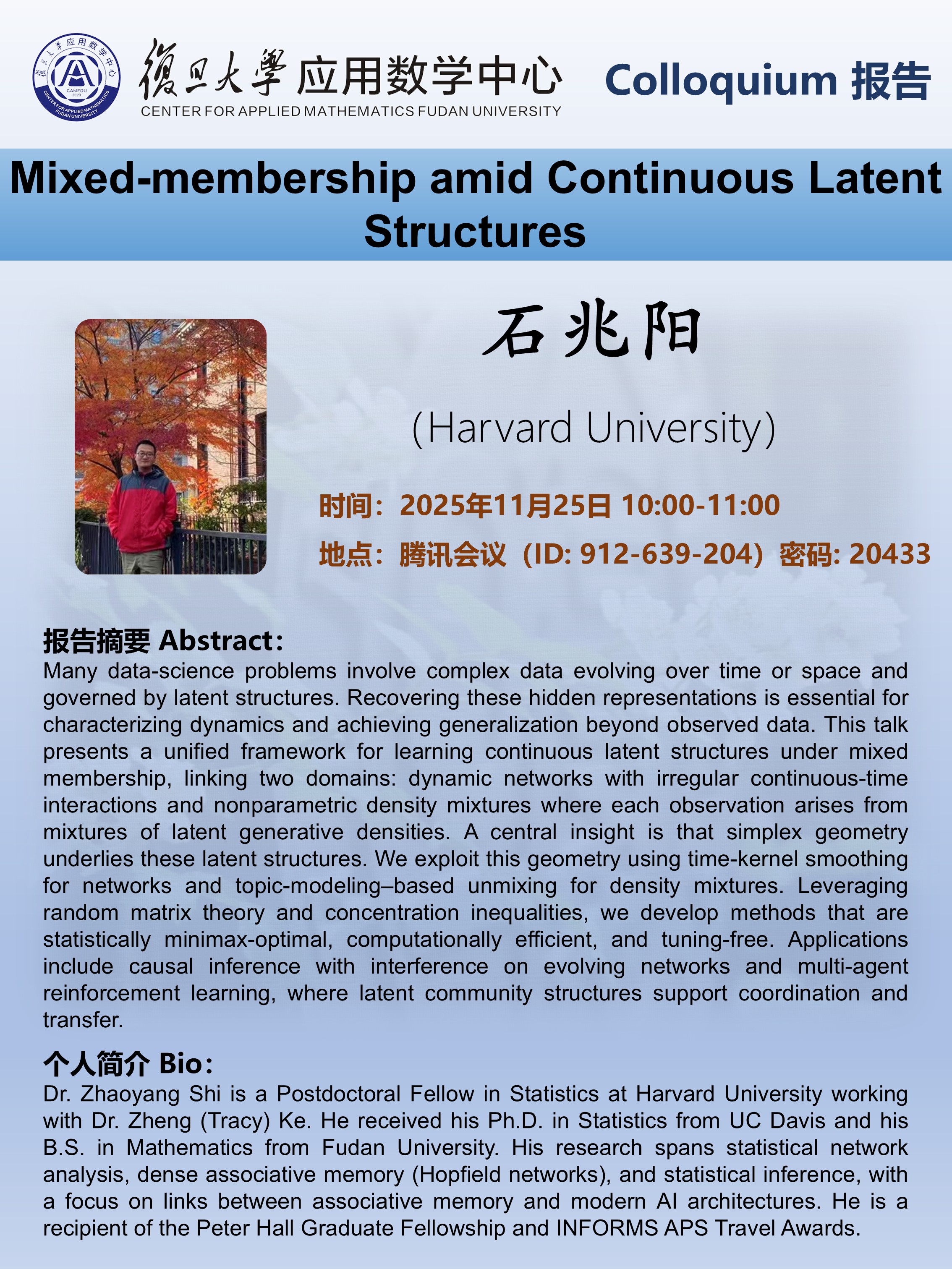 个人简介 Bio:Dr. Zhaoyang Shi is a Postdoctoral Fellow in Statistics at Harvard University working with Dr. Zheng (Tracy) Ke. He received his Ph.D. in Statistics from UC Davis and his B.S. in Mathematics from Fudan University. His research spans statistical network analysis, dense associative memory (Hopfield networks), and statistical inference, with a focus on links between associative memory and modern AI architectures. He is a recipient of the Peter Hall Graduate Fellowship and INFORMS APS Travel Awards.