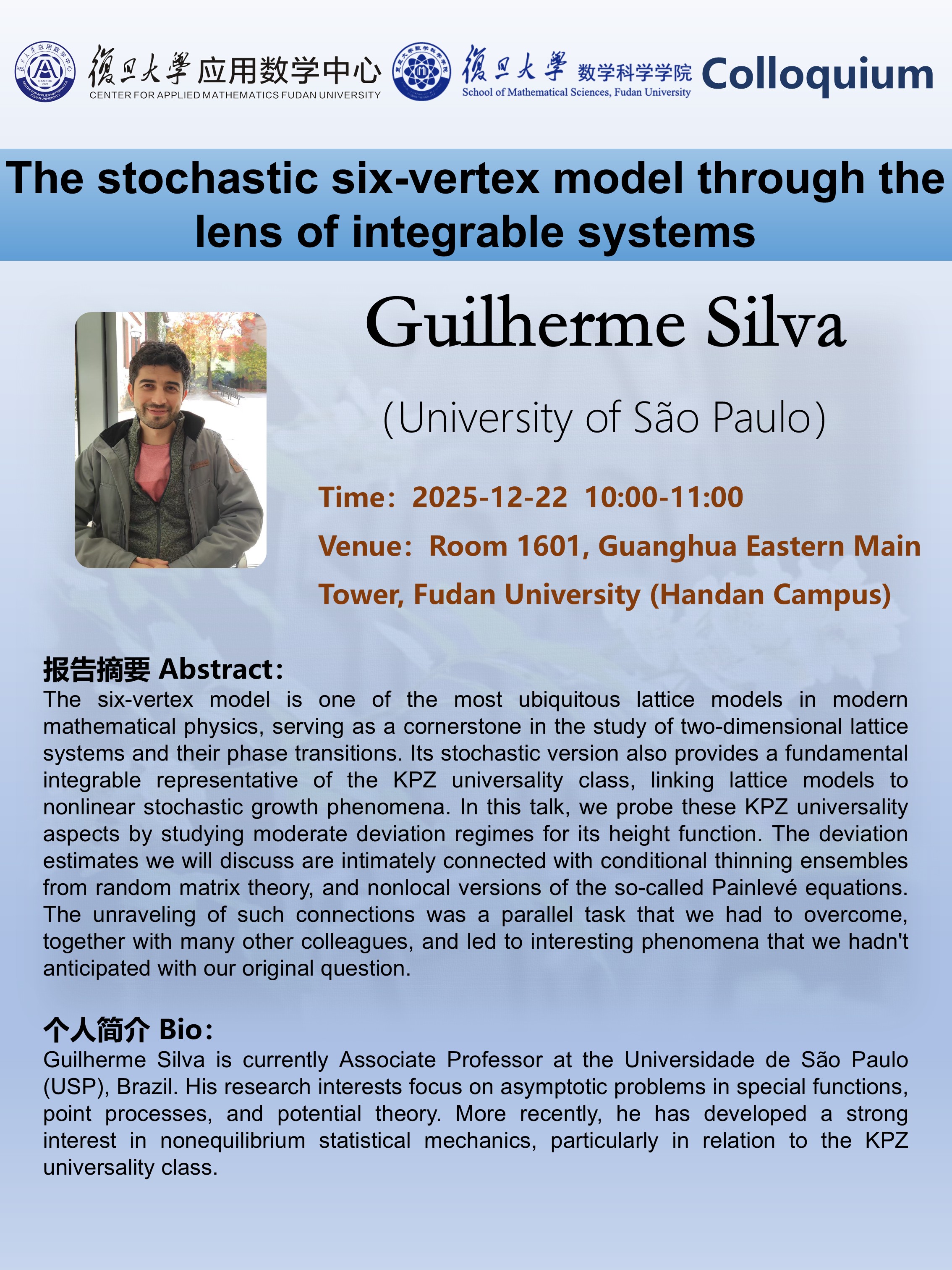 个人简介 Bio: Guilherme Silva is currently Associate Professor at the Universidade de São Paulo (USP), Brazil. His research interests focus on asymptotic problems in special functions, point processes, and potential theory. More recently, he has developed a strong interest in nonequilibrium statistical mechanics, particularly in relation to the KPZ universality class.