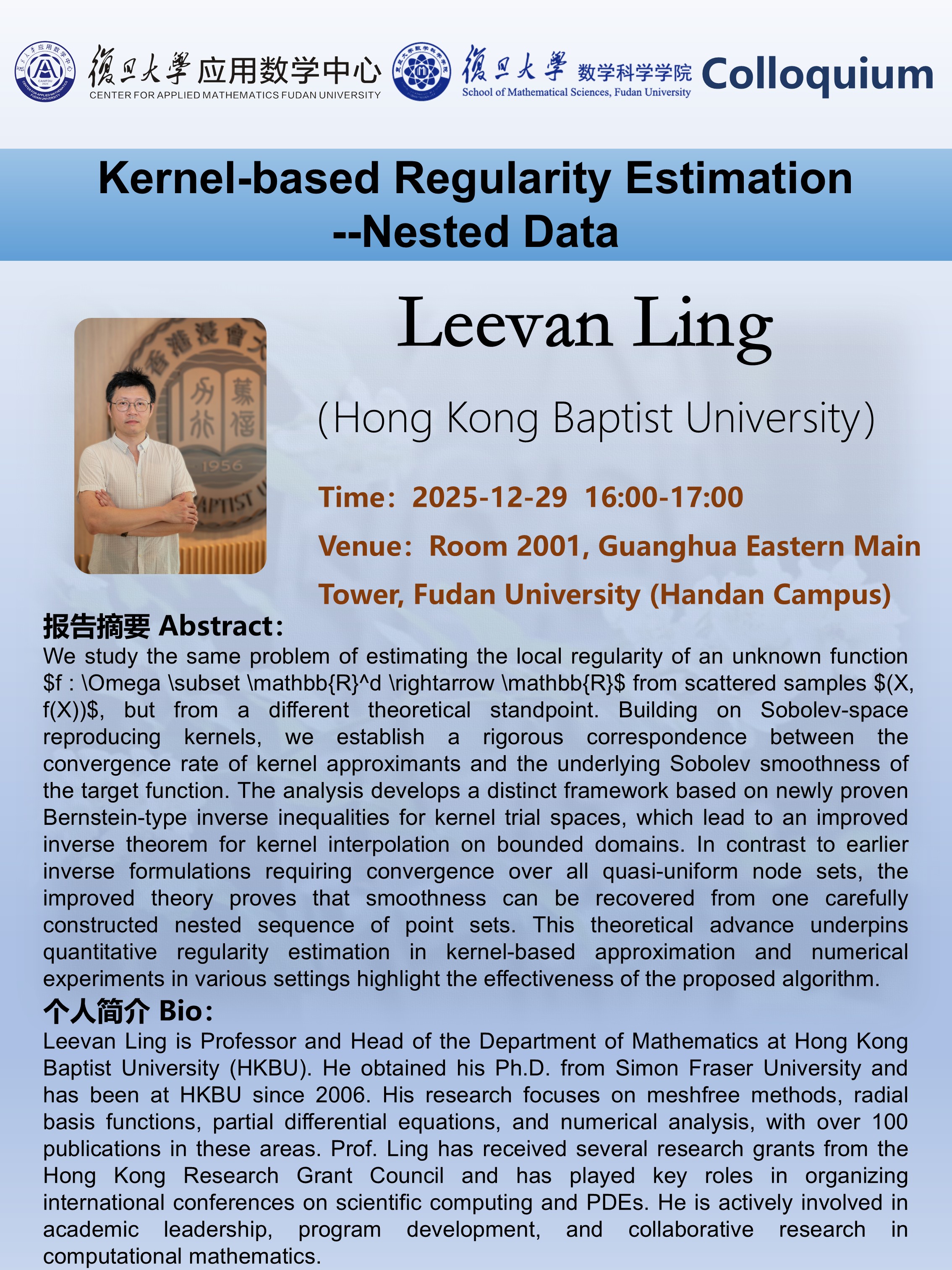报告摘要 Abstract: We study the same problem of estimating the local regularity of an unknown function $f : \Omega \subset \mathbb{R}^d \rightarrow \mathbb{R}$ from scattered samples $(X, f(X))$, but from a different theoretical standpoint. Building on Sobolev-space reproducing kernels, we establish a rigorous correspondence between the convergence rate of kernel approximants and the underlying Sobolev smoothness of the target function. The analysis develops a distinct framework based on newly proven Bernstein-type inverse inequalities for kernel trial spaces, which lead to an improved inverse theorem for kernel interpolation on bounded domains. In contrast to earlier inverse formulations requiring convergence over all quasi-uniform node sets, the improved theory proves that smoothness can be recovered from one carefully constructed nested sequence of point sets. This theoretical advance underpins quantitative regularity estimation in kernel-based approximation and numerical experiments in various settings highlight the effectiveness of the proposed algorithm.